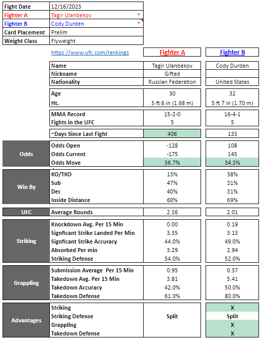 Since 2020, Durden has only lost to the undefeated Muhammad Mokaev, and I think comes into this fight the better fighter nearly everywhere. Add in the more than a year of ring rust from Ulanbekov, and I like Durden to grind out another decision win.